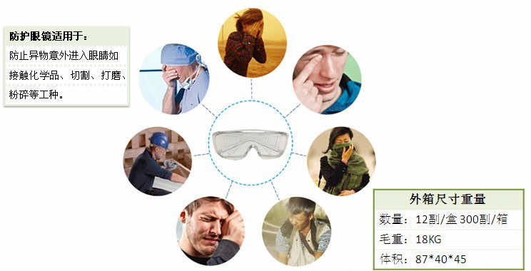 鏡架透明、側(cè)邊通風(fēng),可與光學(xué)眼鏡同時佩戴,尤其適合參觀者。 通過EN166標(biāo)準(zhǔn)認(rèn)證。 包裝:12副/盒 、300副/箱