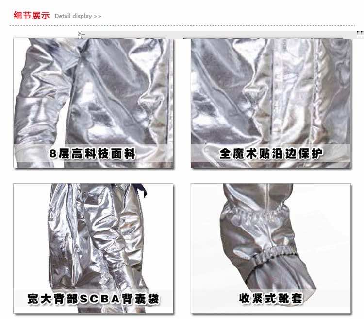 119型高端鍍鋁避火服,8層不同功能的材料層復(fù)合粘合,表面特有鍍鋁技術(shù),有效防止冷熱潮濕環(huán)境引起鋁層脫落,內(nèi)外雙層熱帖帶式縫合可以保證舒適的同時(shí)有效增加機(jī)械防護(hù)性能。