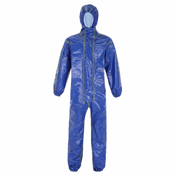 雷克蘭EBR228帶帽連體防化服CBFR采用PVC/EVOH/ 阻燃木漿 / 聚酯無紡布多層面料結構,具有更好的阻燃和防化性能;