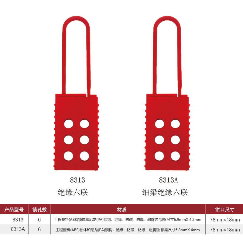漢盾 HD-SL8313A 絕緣六聯(lián)搭扣式鎖具 細(xì)梁 ABS鎖體 尼龍鎖鉤 紅色(1個(gè)/盒 204個(gè)/箱)