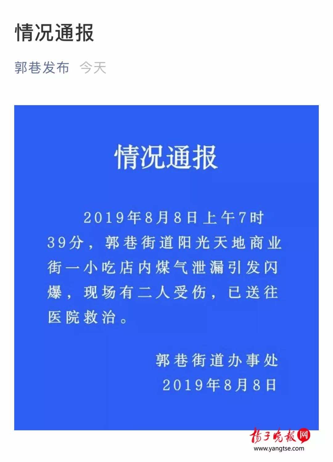 8月8日11點01分,吳中區(qū)人民政府郭巷街道辦事處官方微信“郭巷發(fā)布”發(fā)布情況通報:2019年8月8日上午7時39分,郭巷街道陽光天地商業(yè)街一小吃店內煤氣泄漏引發(fā)閃爆,現(xiàn)場有二人受傷,已送往醫(yī)院救治。