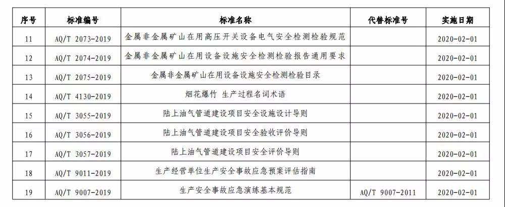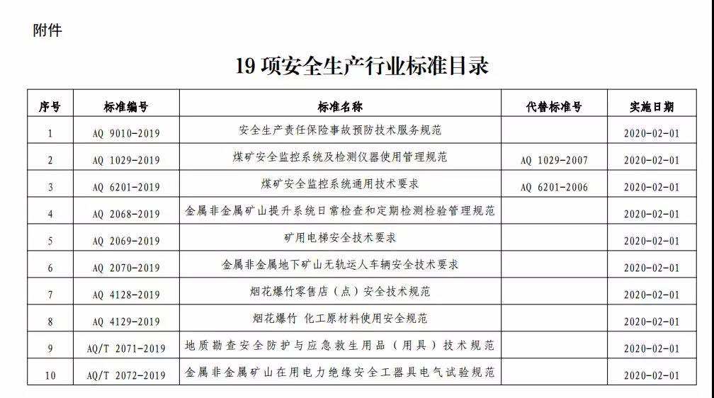 中華人民共和國應急管理部批準以下19項安全生產(chǎn)行業(yè)標準(目錄見附件),自2020年2月1日起施行,現(xiàn)予以公布。