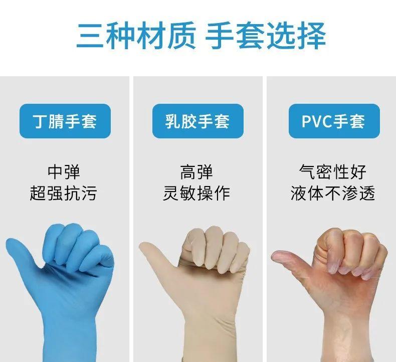 首先,在選擇一次性手套時,要考慮手套材質。一次性手套按材質主要包括PVC、PE、丁腈和乳膠幾類。