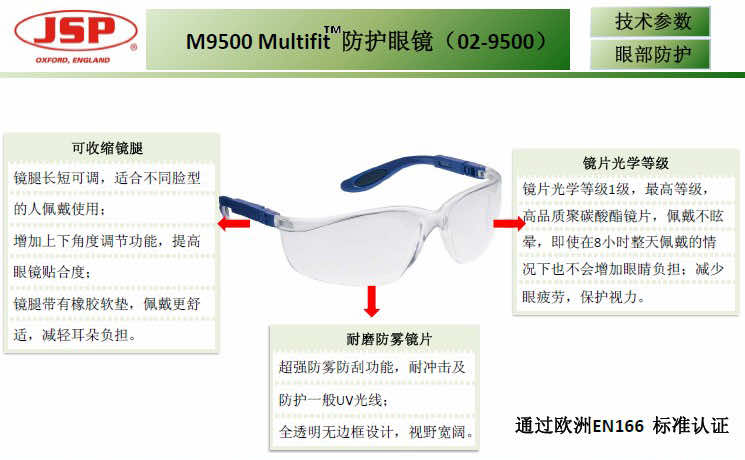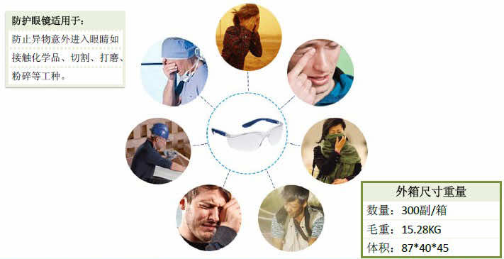 全透明鏡片、耐沖擊及防護一般UV光線,視野寬闊 藍色鏡腿可全方位---長度及角度均可調(diào)整 鏡腿帶有橡膠軟墊,佩戴更舒適持久 鏡片防霧、防刮擦 符合EN166標準認證 包裝:12副/盒 、300副/箱