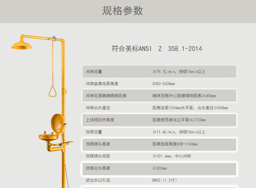 主體材質(zhì):304不銹鋼+ABS防腐涂層 底 座:鋁合金壓鑄 執(zhí)行標(biāo)準(zhǔn):美標(biāo)ANSI Z 358.1-2014