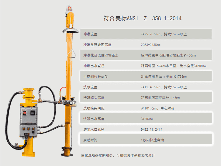 主體材質(zhì):304不銹鋼 防護等級:IP65 執(zhí)行標準:美標ANSI Z 358.1-2014