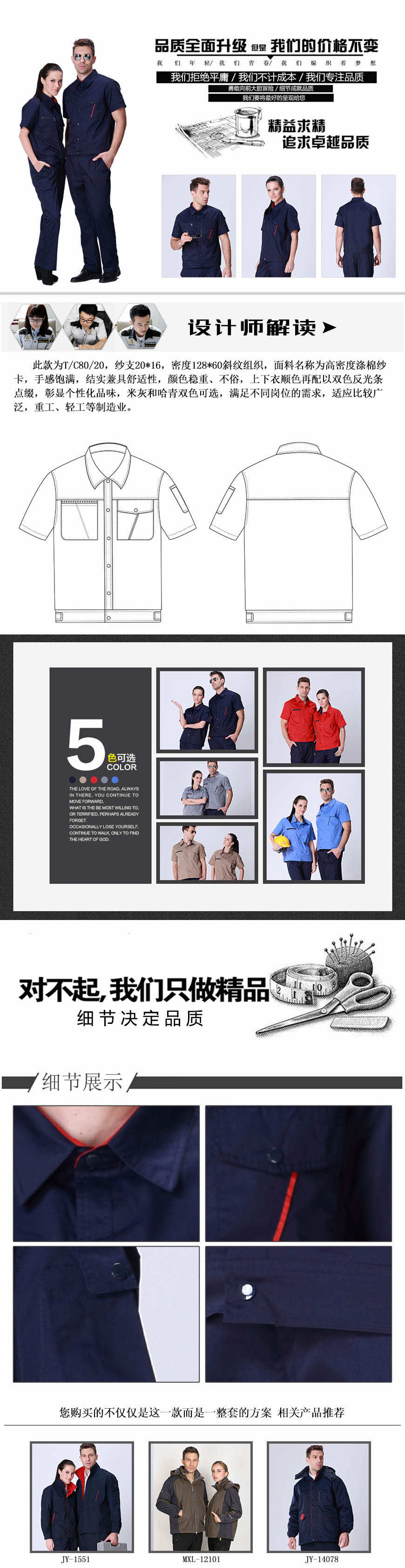 此款上衣為T/C65/35紗支45*45密度130*70,紗織斜紋組織,面料名稱髙支精品細(xì)斜,經(jīng)典襯衣領(lǐng)和傳統(tǒng)夾克的完美結(jié)合,豪放不失嚴(yán)謹(jǐn),銀灰、深藍(lán)、大紅、卡其、淺藍(lán)五色可選,前胸兜左右不對(duì)稱式口袋設(shè)計(jì),頓感富有變化而不呆板,特別是深藍(lán)色兜口拉鏈,傲然鑲嵌,不俗而典雅,再配上經(jīng)柔軟處理而且加密織造的面料,確為 經(jīng)典系列裝,賦予企業(yè)的不是一點(diǎn)而是一個(gè)面,是一個(gè)整體形象,考慮更為周全的是下衣面料為T/R65/35,紗織32/2*32/2密度56*52此面料最大特點(diǎn)用黏膠代替棉,既保留了棉的舒適性,又?jǐn)M補(bǔ)了棉易起皺的缺點(diǎn),順滑不易起皺,此系列適合商超、物流、重工、輕工制造業(yè)等行業(yè)。