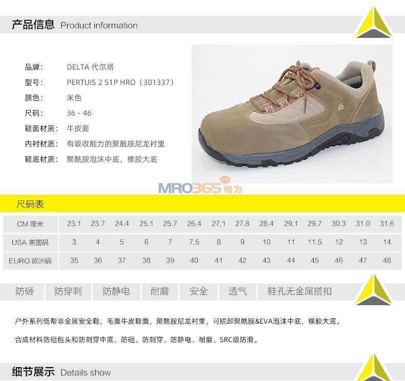 代爾塔301337 低幫防砸防刺穿安全鞋,毛面牛皮鞋面,聚酰胺尼龍襯里,可脫卸聚酰胺&EVA泡沫中底,橡膠大底。合成材料防砸包頭和防刺穿中底,防砸、防刺穿、防靜電、耐磨、SRC級(jí)防滑。